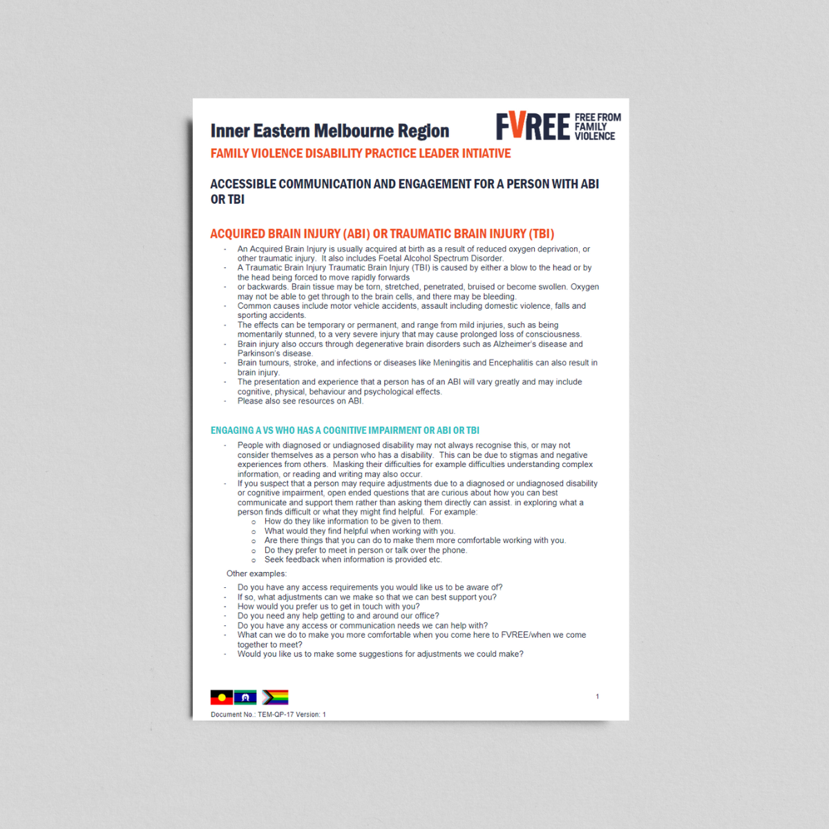 About this resource: A summary of some key information and approaches to engaging a person who has ABI or TBI. Developed by the Eastern Region Family Violence Disability Practice Leader Initiative.