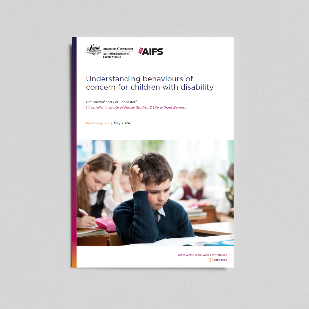 About this resource: This practice guide draws on research evidence and practitioner knowledge to provide an overview of approaches to understanding the behaviours of children with disability and the concept of ‘behaviours of concern’. It includes some practical principles for working with children with disability and their families. This guide is primarily intended for use by child and family support professionals who may work with children with disability and their families but may not be specialists in providing disability support. It synthesises general research evidence and broad practice knowledge. It does not include guidance on