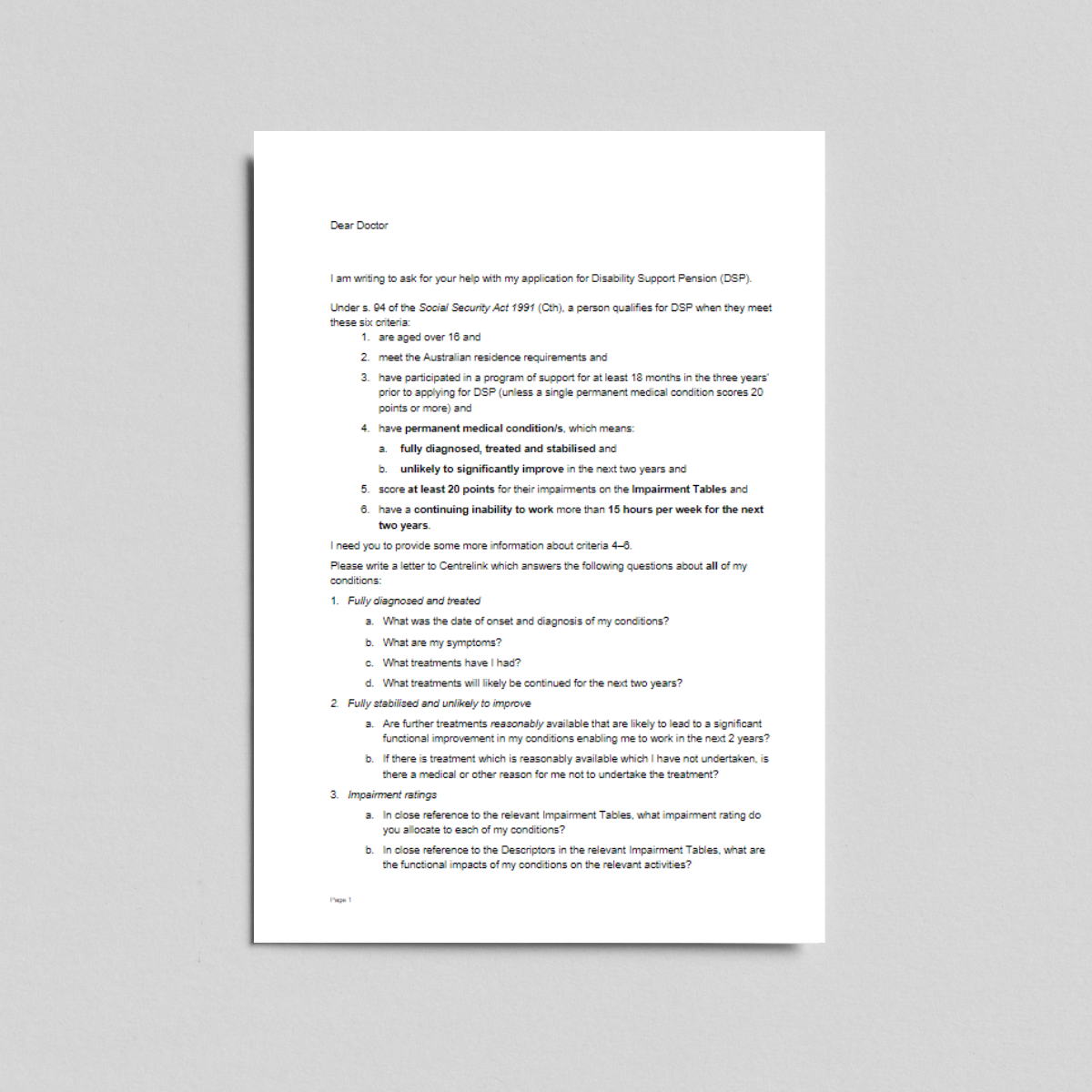 About this resource: The Letter of Support Template can be used by people who would like to apply for the DSP with the support of the General Practitioner. The template sets out the information an applicant will require from their General Practitioner to support the medical evidence requirements for their DSP application.