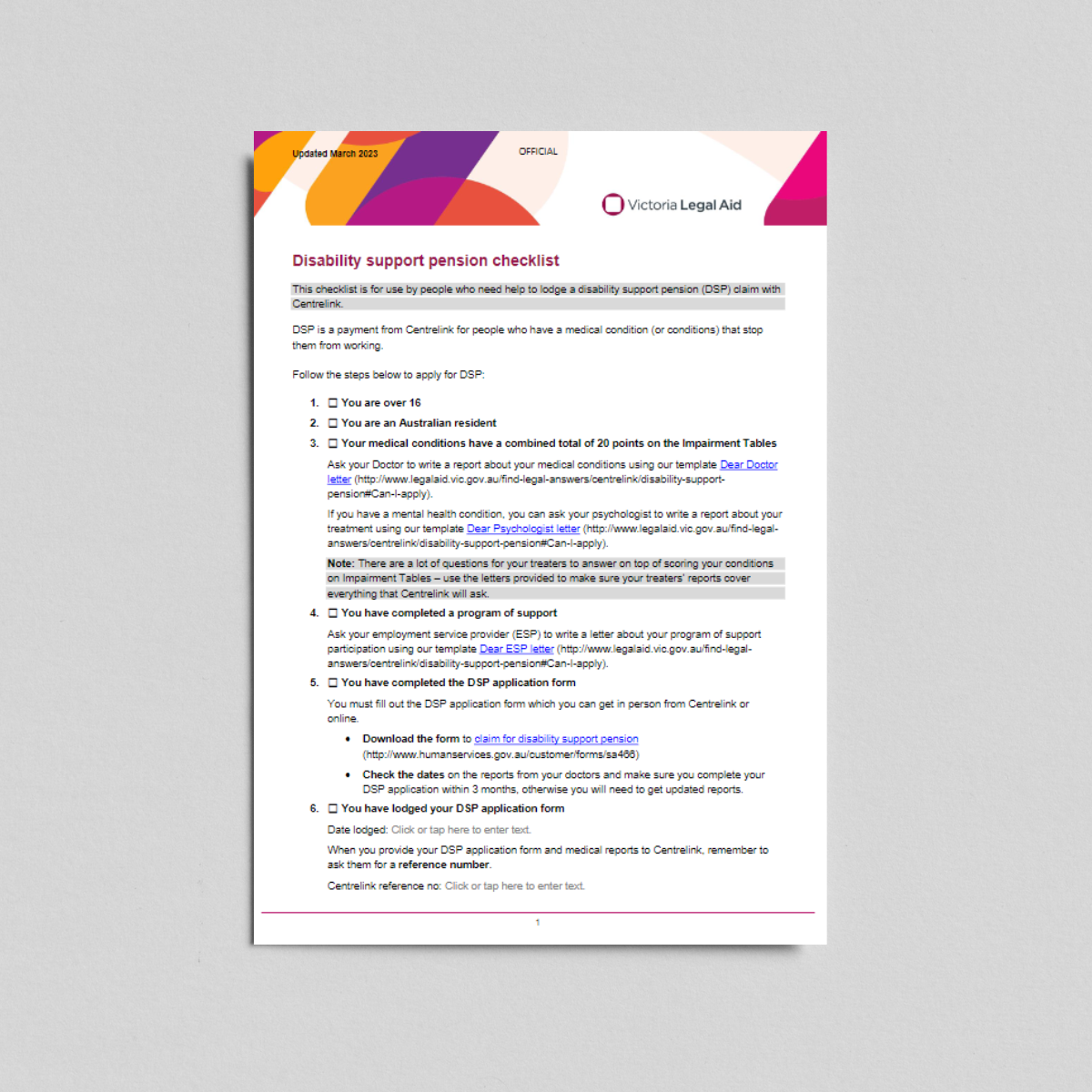 About this resource: Legal Aid Victoria have created a checklist that DSP applicants can use to help prepare to lodge their DSP application with Centrelink.