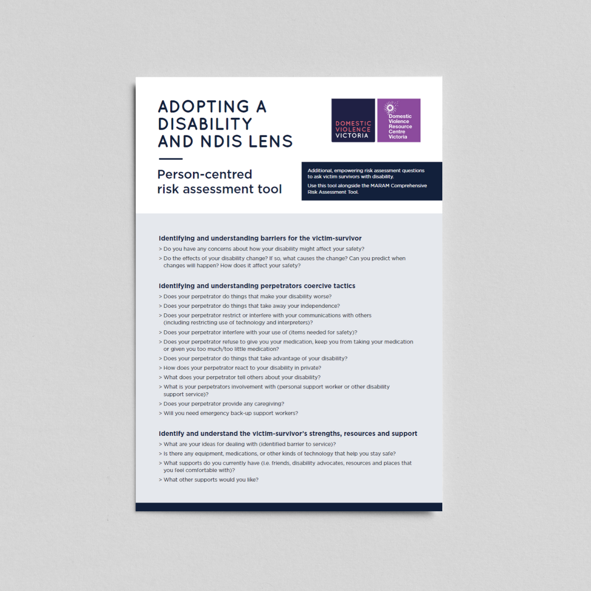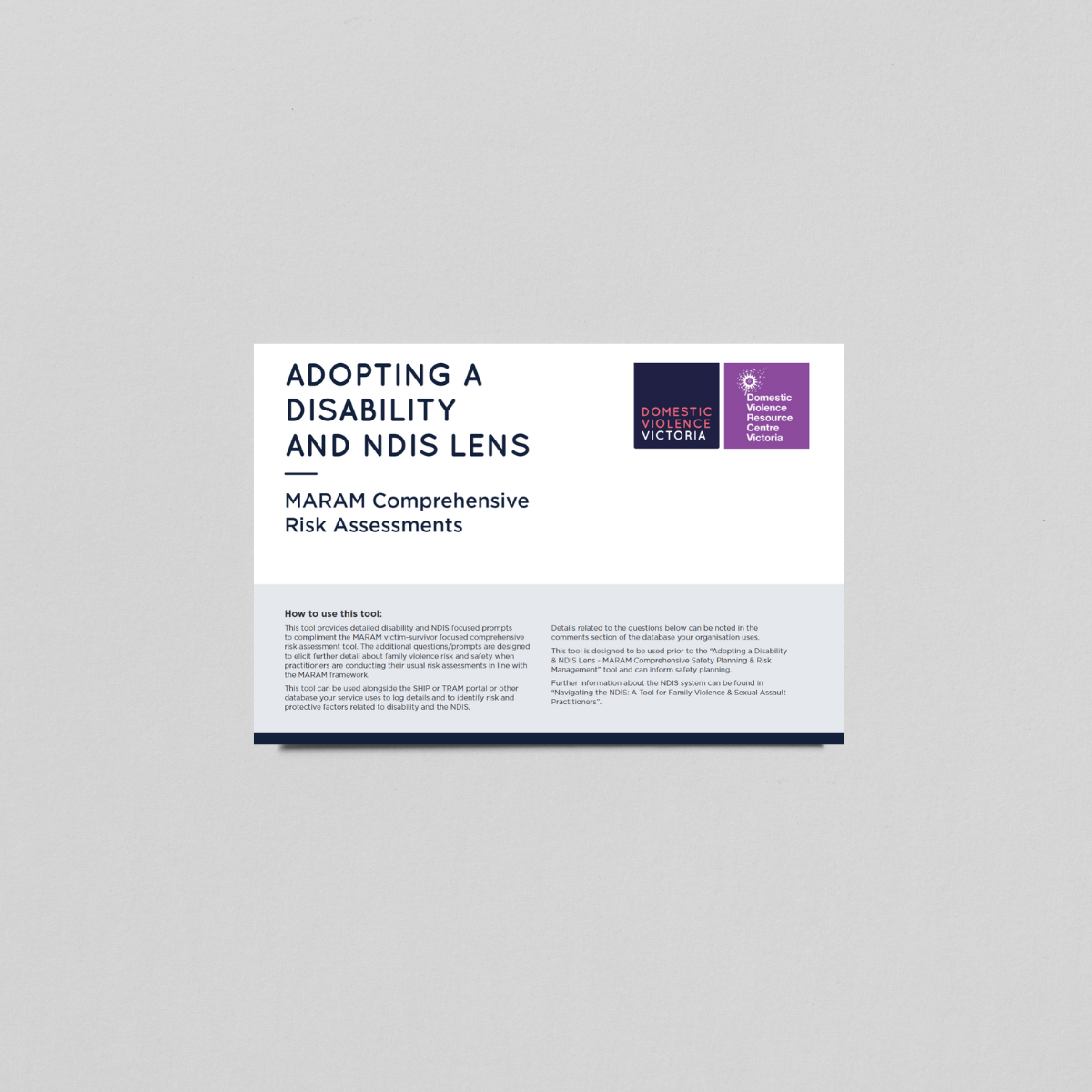 About this resource: This tool provides detailed disability and NDIS focused prompts to compliment the MARAM victim-survivor focused comprehensive risk assessment tool. The additional questions/prompts are designed to elicit further detail about family violence risk and safety when practitioners are conducting their usual risk assessments in line with the MARAM framework.