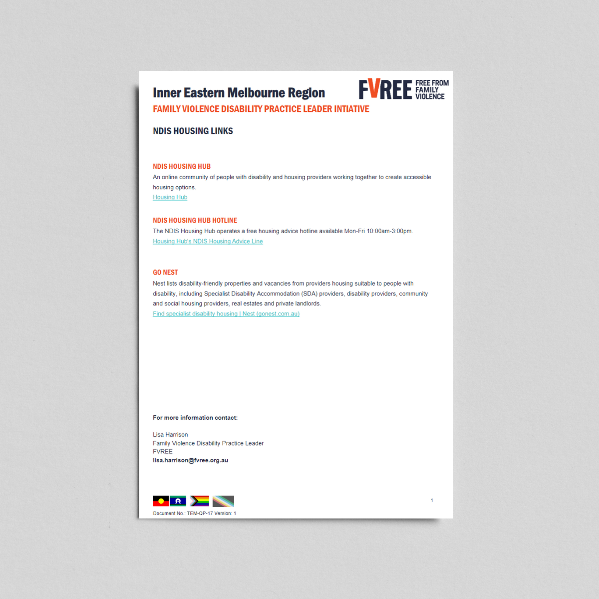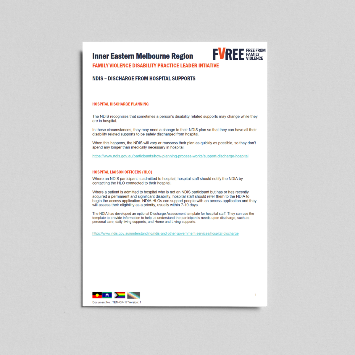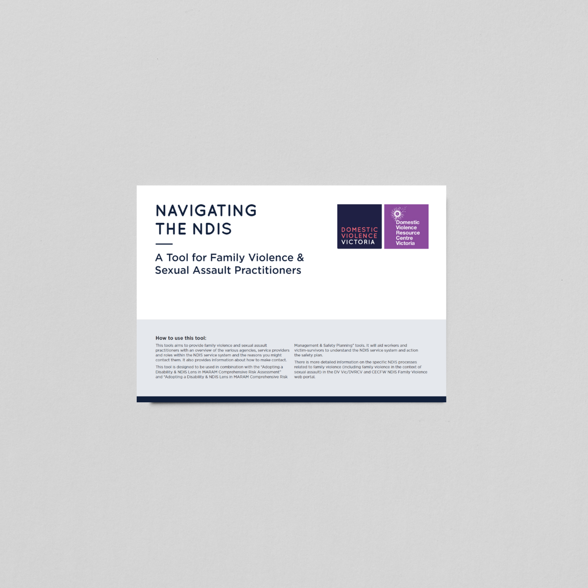 This tool is designed to be used in combination with the “Adopting a disability & NDIS lens in MARAM Comprehensive Risk Assessment”, “Adopting a disability & NDIS lens in MARAM Comprehensive Risk Management & Safety Planning” and “Navigating the NDIS for Family Violence & Sexual Assault workers” tools.
