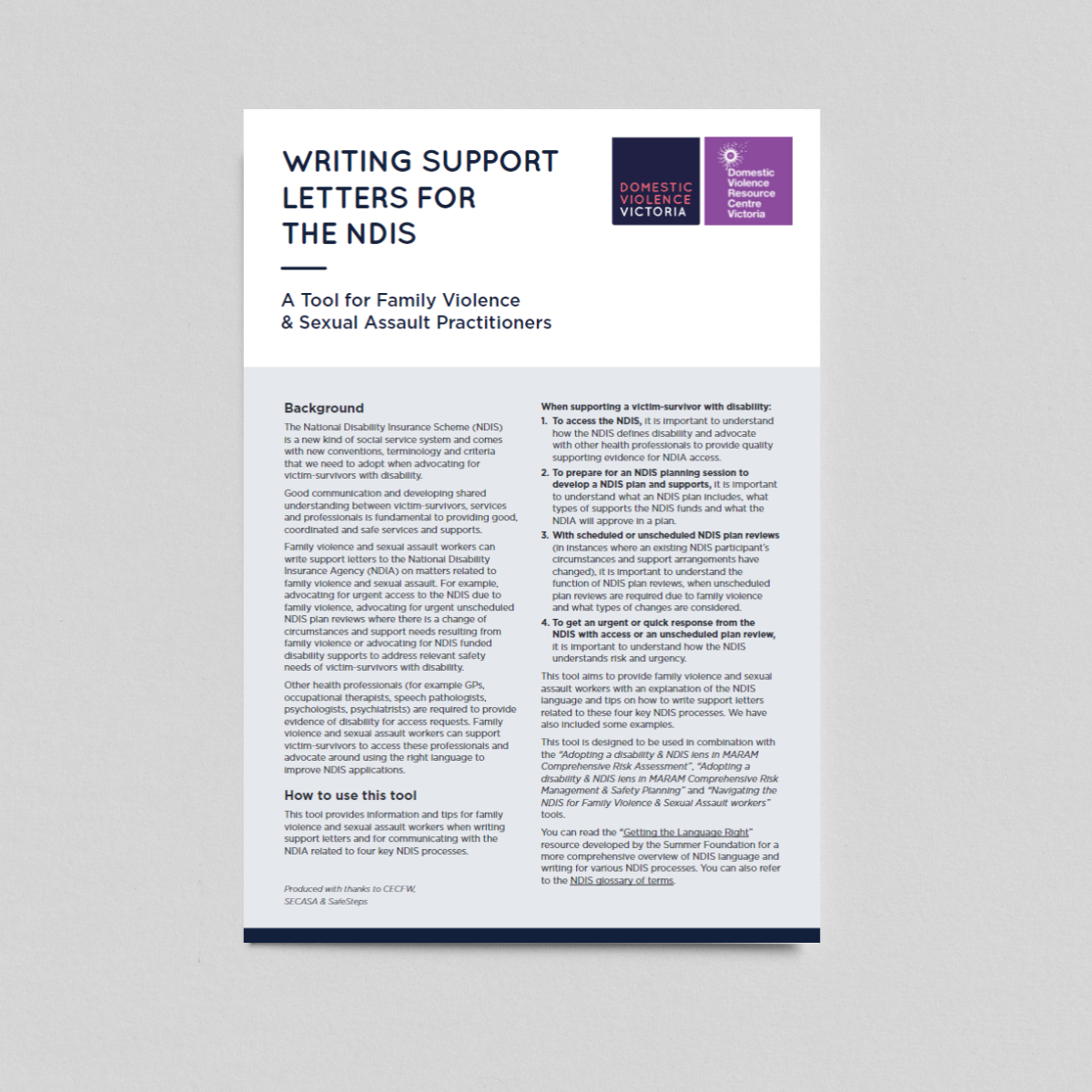 About this resource: This tool aims to provide family violence and sexual assault workers with an explanation of the NDIS language and tips on how to write support letters related to these four key NDIS processes. We have also included some examples.