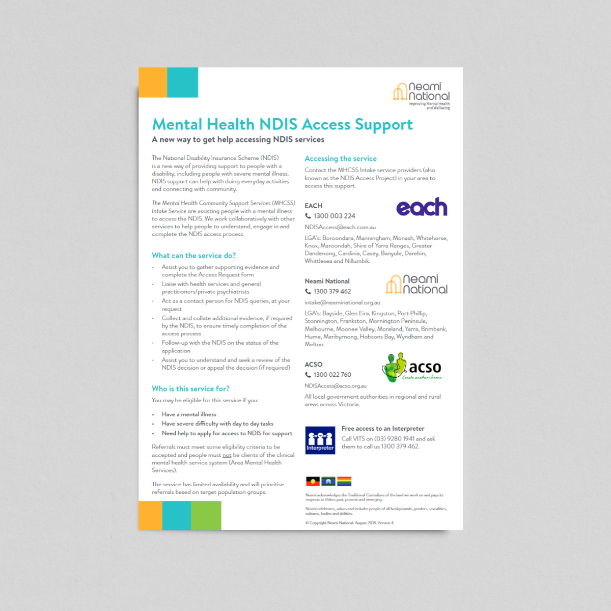 About this resource: The Mental Health NDIS Access Support service provides support to people with psychosocial disability to navigate access to the NDIS.