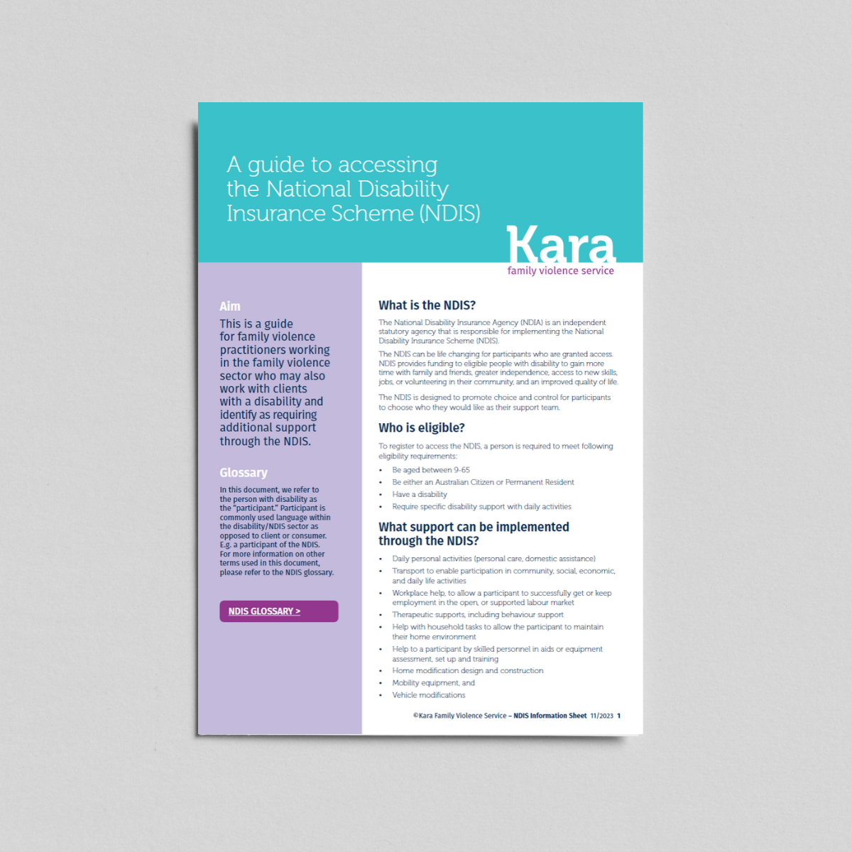 About this resource: Kara Family Violence Service have developed a guide for people they are supporting to assist them with information around navigating access to the NDIS as well as managing their NDIS plans.