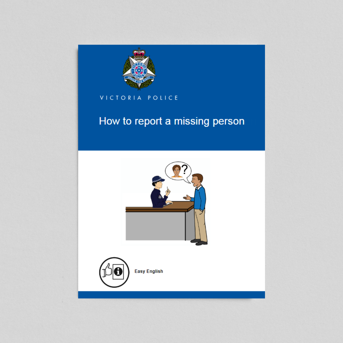 About this resource: An easy read resource produced by the Victoria Police that explains how to report a missing person to Victoria