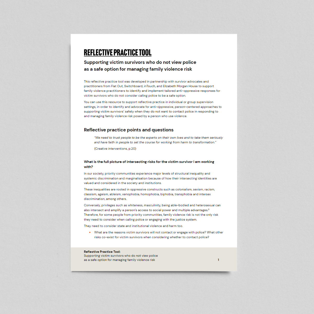 practitioners from Flat Out, Switchboard, inTouch, and Elizabeth Morgan House to support family violence practitioners to identify and implement tailored anti-oppressive responses for victim survivors who do not consider calling police to be a safe option. You can use this resource to support reflective practice in individual or group supervision settings, in order to identify and advocate for anti-oppressive, person-centered approaches to supporting victim survivors’ safety when they do not want to contact police in responding to and managing family violence risk posed by a person who use violence.