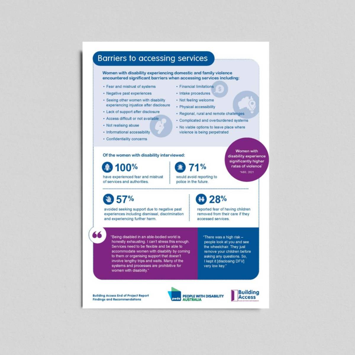 About this resource: An infographic to highlight barriers women with disability experience when seeking to report or access safety from family violence.