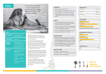 This suite of Personas was developed by the Eastern Regional Coordinators to bring to life the experiences of clients who may interact with our services. Personas can be used at forums, training and events, as well as for strategic planning, client journey mapping and advocacy.