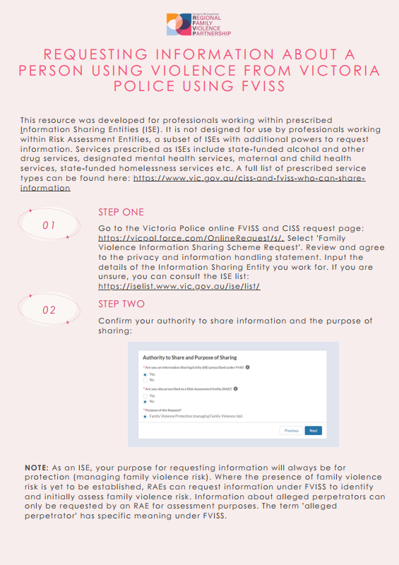 The FVISS Resource – Requesting Information about a Person Using Violence from Victoria Police was developed specifically for professionals working in services prescribed as Information Sharing Entities (ISEs) under the Family Violence Information Sharing Scheme (FVISS) and guides them through the process of requesting information from Victoria Police about people using violence step by step.