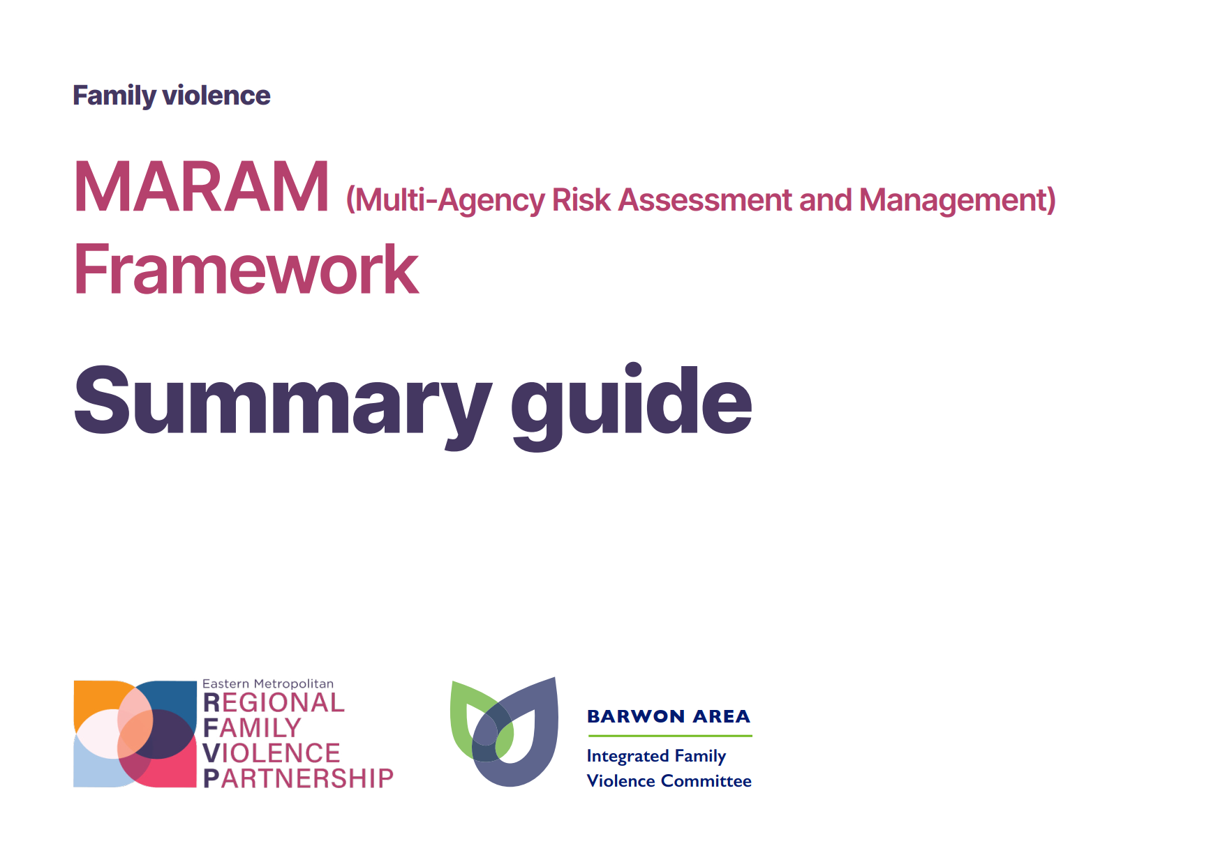 The MARAM Summary Guide was developed by the Barwon Area Integrated Family Violence Committee and adapted for use in the Eastern Metropolitan Region by the RFVP. It is designed for all professionals prescribed to MARAM and collates essential information about MARAM and Information Sharing in a easy, quick reference booklet. Physical copies are available to order. Please contact the RFVP team if you are interested in ordering physical copies: admin.rfvp@fvree.org.au