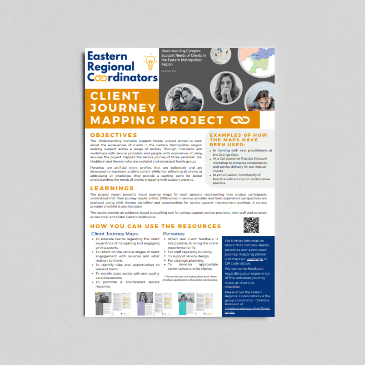 The ‘Understanding Complex Support Needs project’ aimed to learn about the experiences of clients in the Eastern Metropolitan Region seeking support across a range of sectors. Through interviews and workshops with service providers and people with experience of using services, the project mapped the service journey of three personas: Joe, Maddison and Neveah. The report presents visual journey maps for each persona representing how project participants thought their journey would unfold. Differences in service provider and lived experience perspectives are explored, along with themes identified and opportunities for service system improvement.