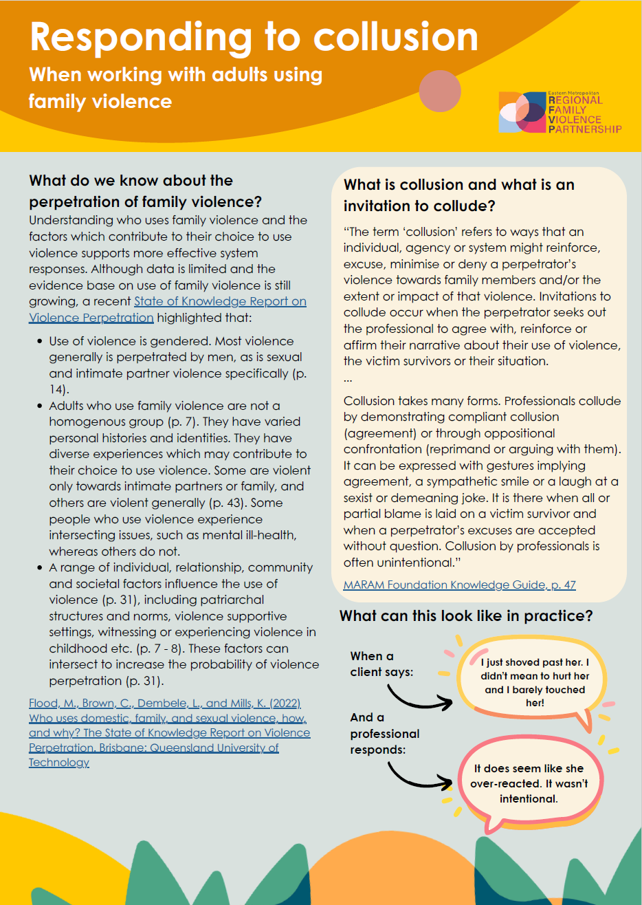 The MARAM Summary Guide was developed by the Barwon Area Integrated Family Violence Committee and adapted for use in the Eastern Metropolitan Region by the RFVP. It is designed for all professionals prescribed to MARAM and collates essential information about MARAM and Information Sharing in a easy, quick reference booklet. Physical copies are available to order. Please contact the RFVP team if you are interested in ordering physical copies: admin.rfvp@fvree.org.au