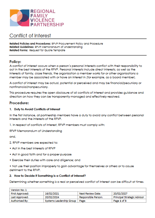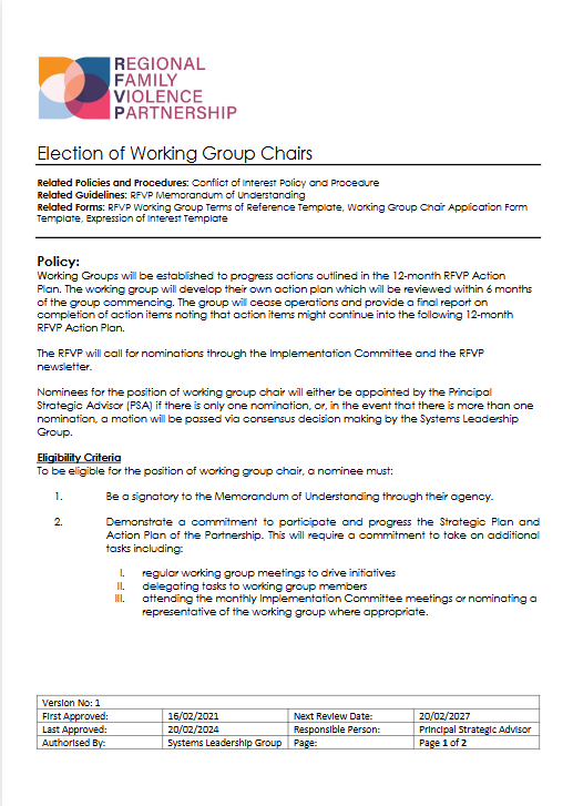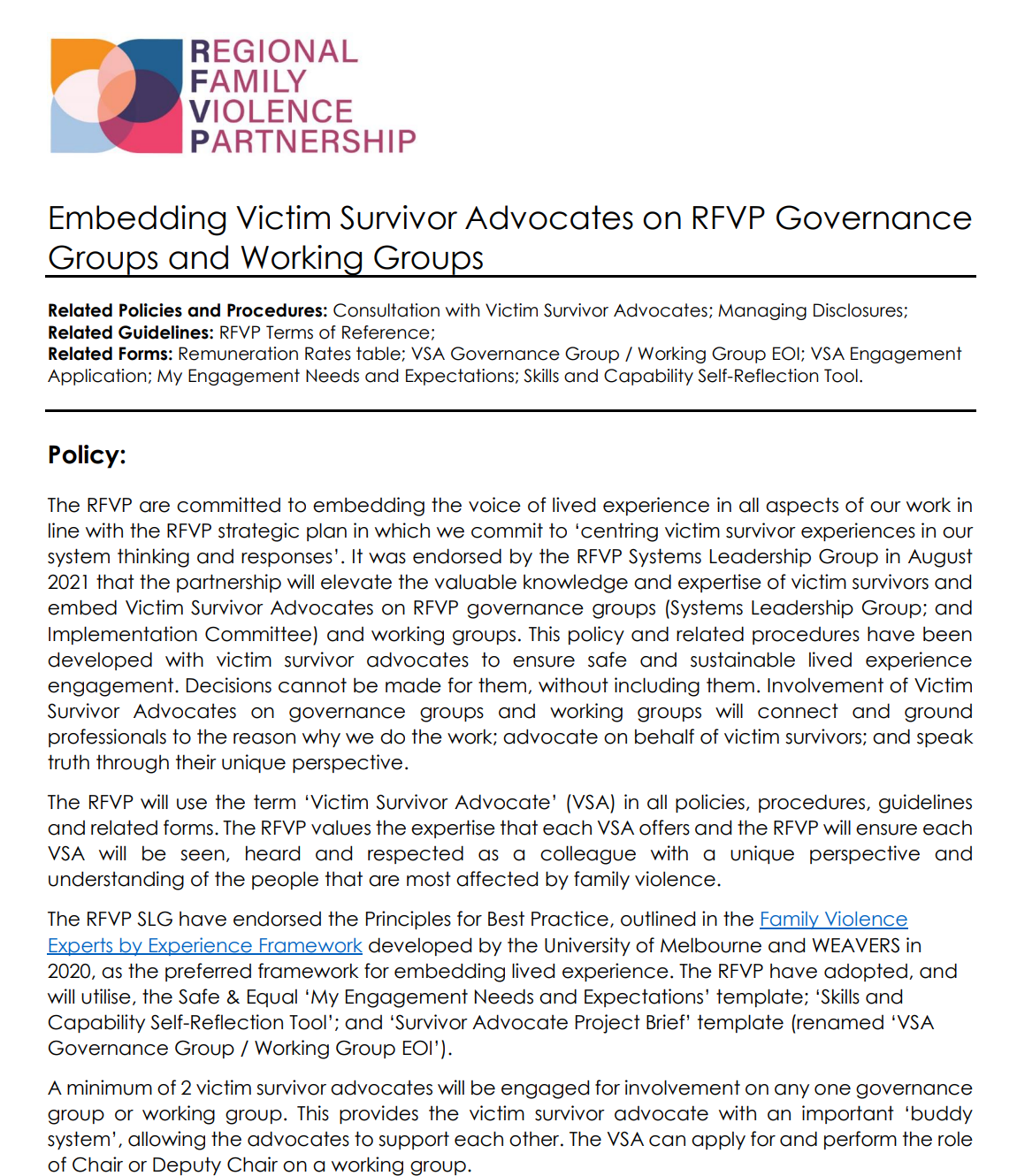 The RFVP have developed a suite of policies and procedures to support embedding lived experience across all governance and working groups. The policies and procedures can be downloaded using the buttons below.